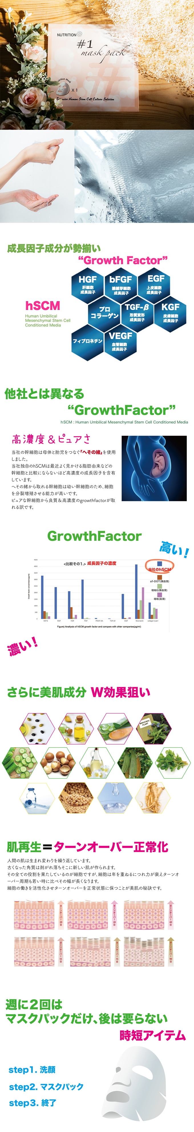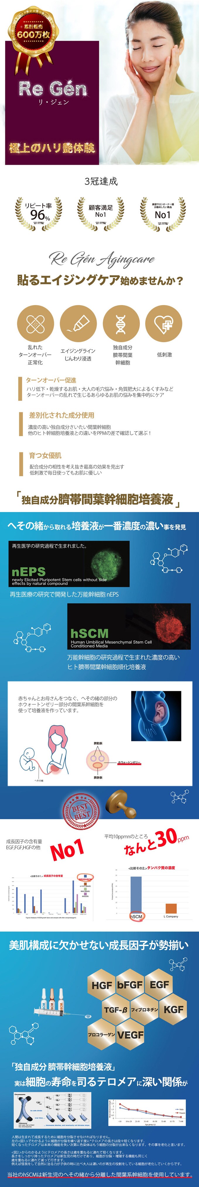 再生医療分野でも注目を集めている話題のヒト幹細胞。弊社は幹細胞を使った再生美容の研究を重ね、たくさんの幹細胞種類の中から最も若い幹細胞であるへその緒の幹細胞から一番濃度の高い成長因子が採取できることを発見しました。濃度の高い成長因子を配合しているため、年齢を重ねることで低下するお肌のハリや弾力、つや、しわに原因の根元から根本的にアプローチをかけることができます。