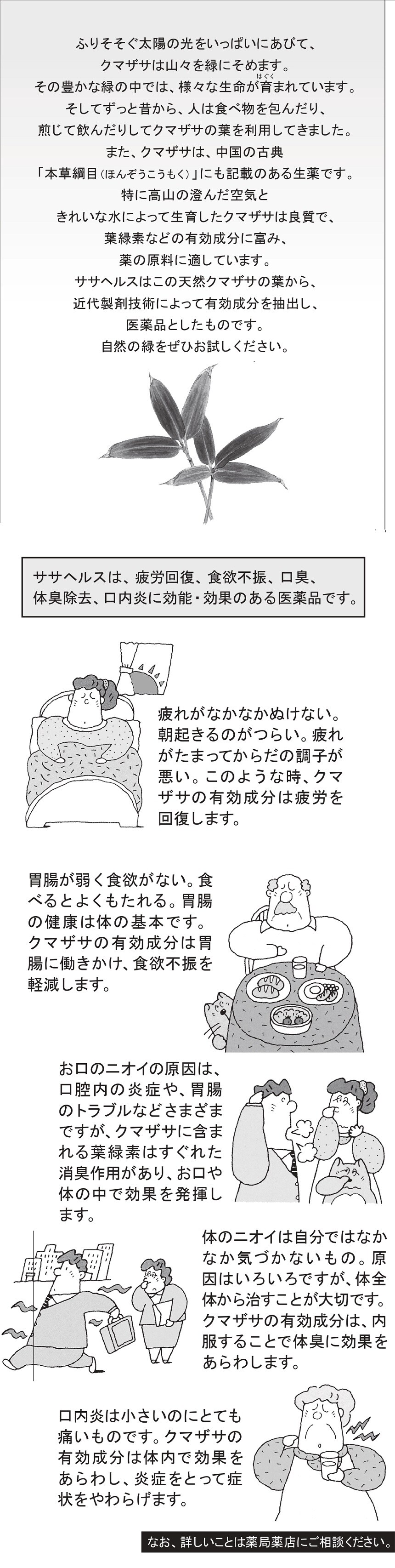 医薬品ササヘルスの効能効果は 疲労回復 食欲不振 口臭 体臭除去 口内炎。複数の効能効果を持っているのは、クマ笹に<巡らせる>力と<鎮める>力両方があるおかげです。