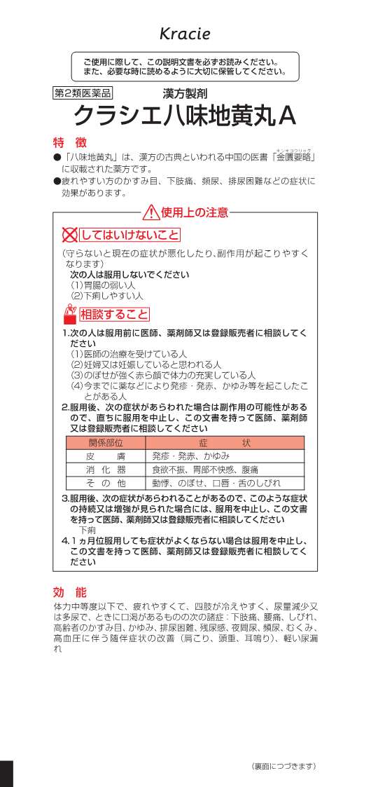 疲れやすい、四肢が冷える、口が渇く、尿の量が安定しないなどの悩みをお持ちの方におすすめです。また、年齢からくるかすみ目や、しびれむくみ、かゆみなど幅広い症状にも効果的です。