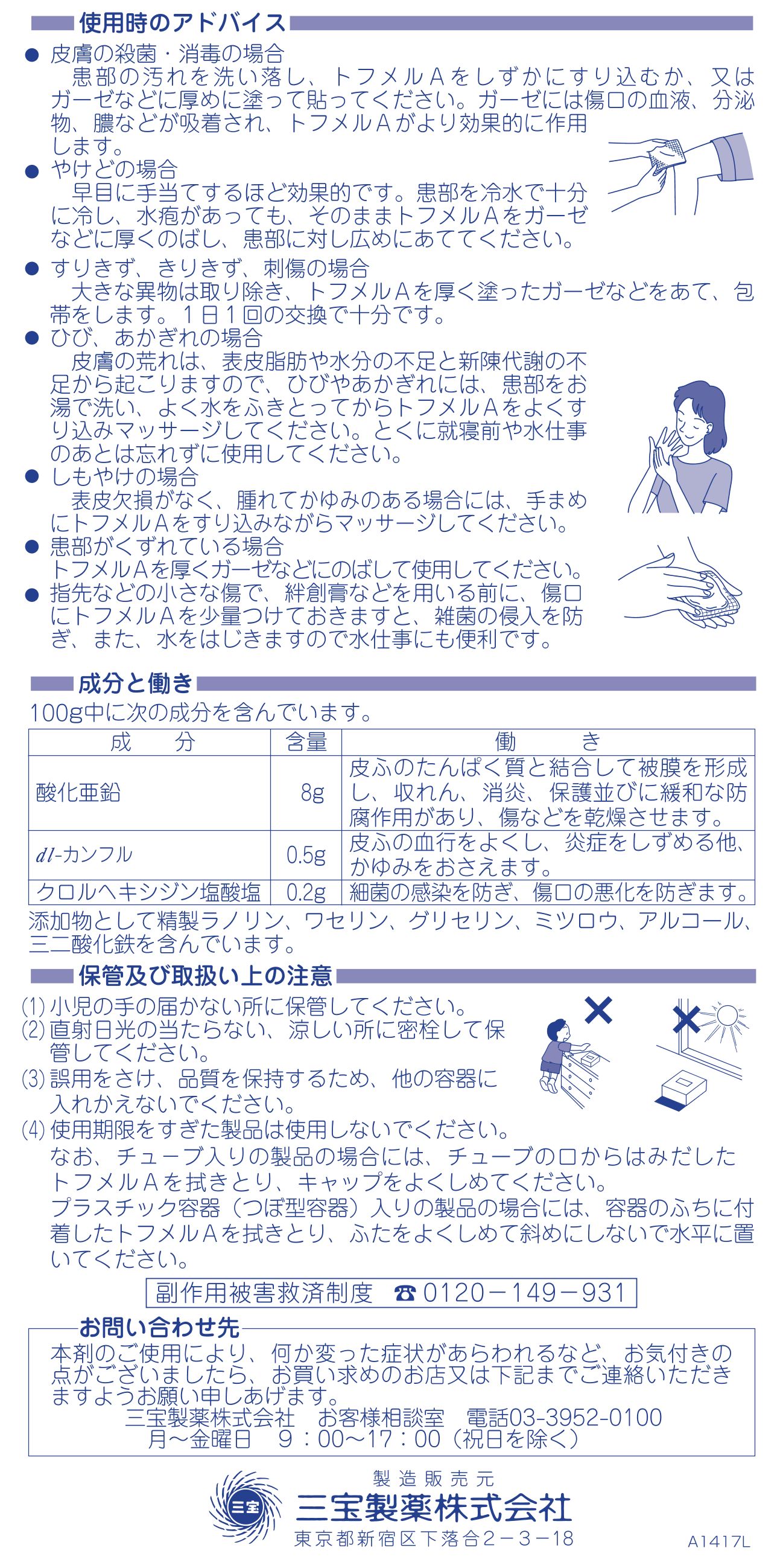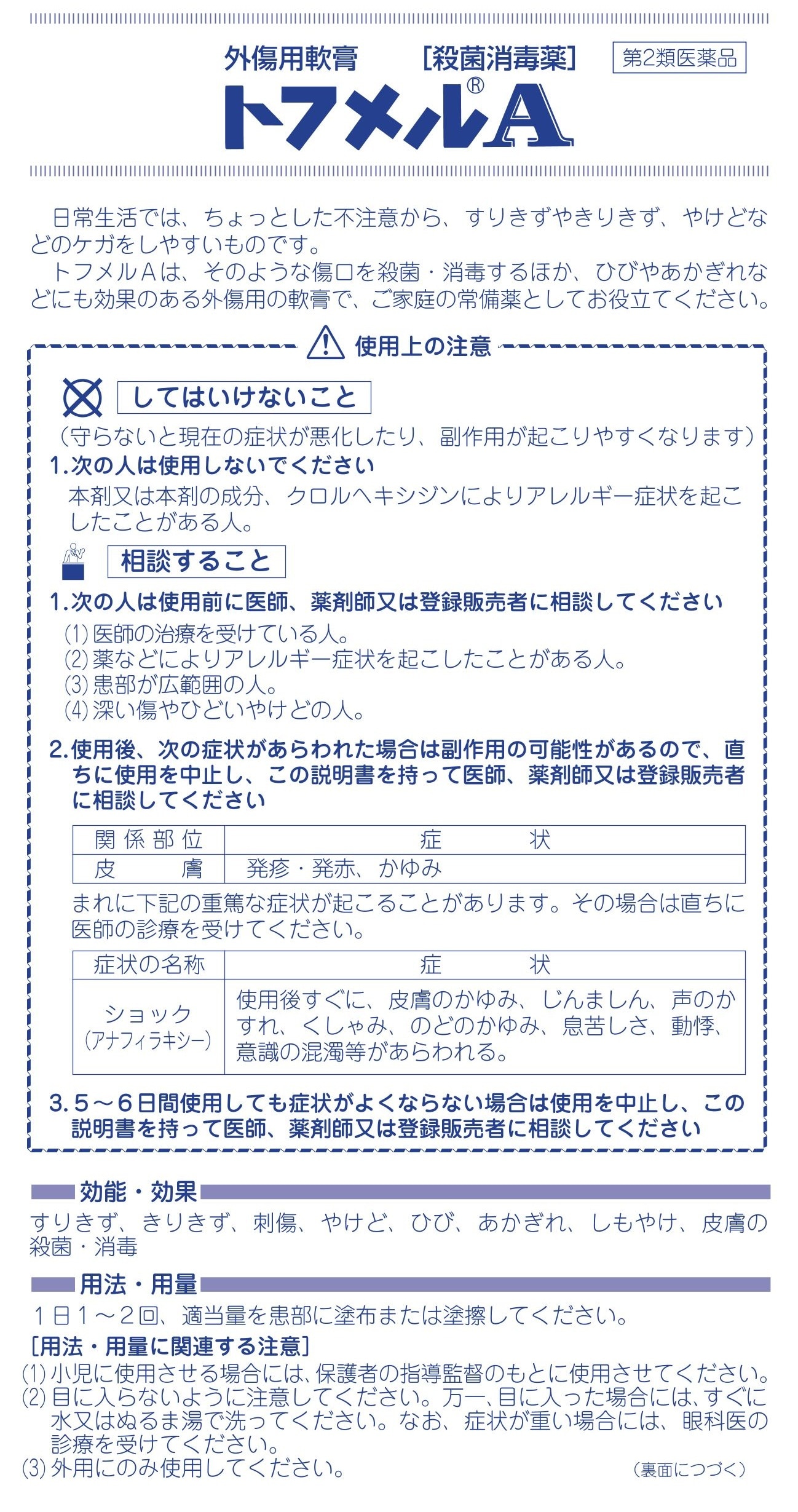 日常生活ではちょっとした不注意からすりきずやきりきず、やけどなどのケガをしやすいものです。トフメルAは、そのような傷口を殺菌・消毒するほか、ひびやあかぎれなどに効果のある外傷用軟膏で、ご家庭の常備薬としてお役立てください。