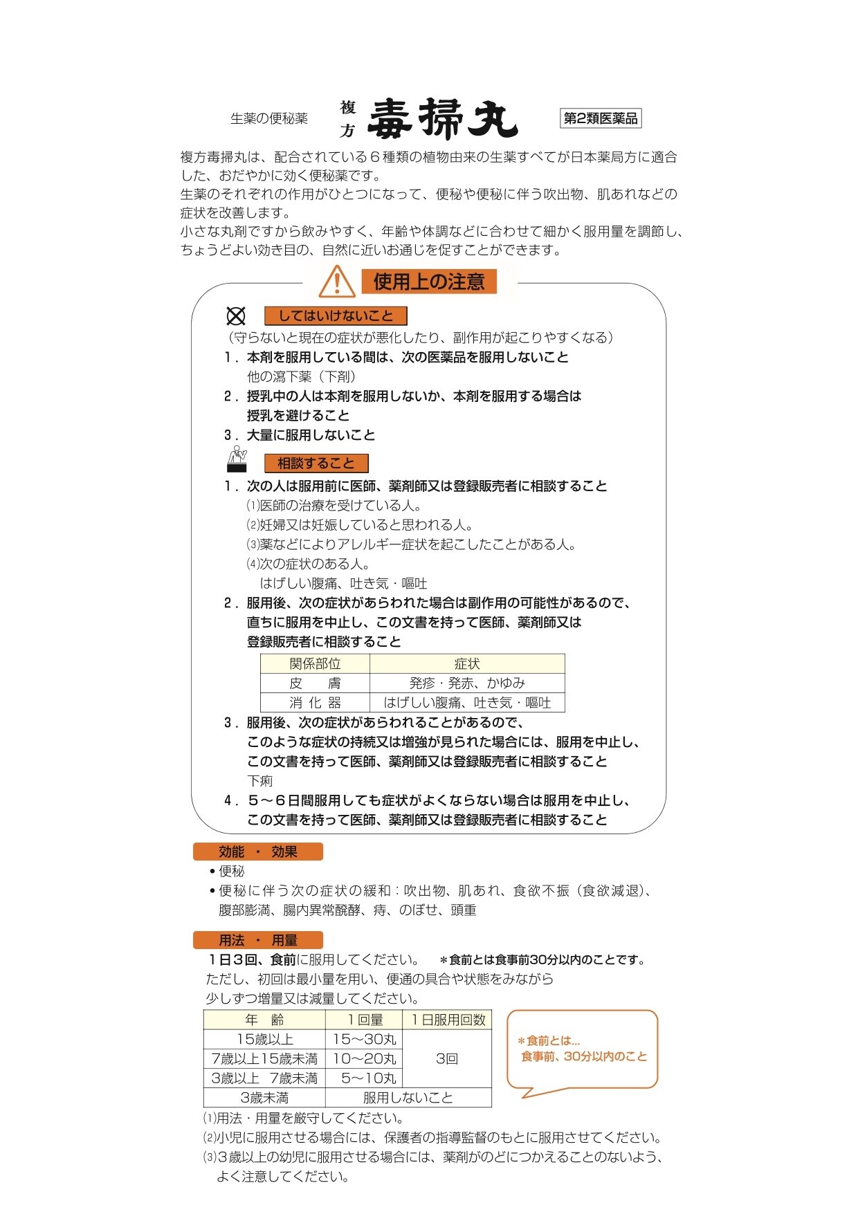 複方毒掃丸(ふくほうどくそうがん)は、配合されている6種類の生薬によって、おだやかに効く便秘薬です。生薬のそれぞれの作用がひとつになって、便秘や便秘に伴う吹出物、肌あれなどの症状を改善します。小さな丸剤ですから飲みやすく、年齢や体調などに合わせて細かく服用量を調節し、ちょうどよい効き目の、自然に近いお通じを促すことができます。