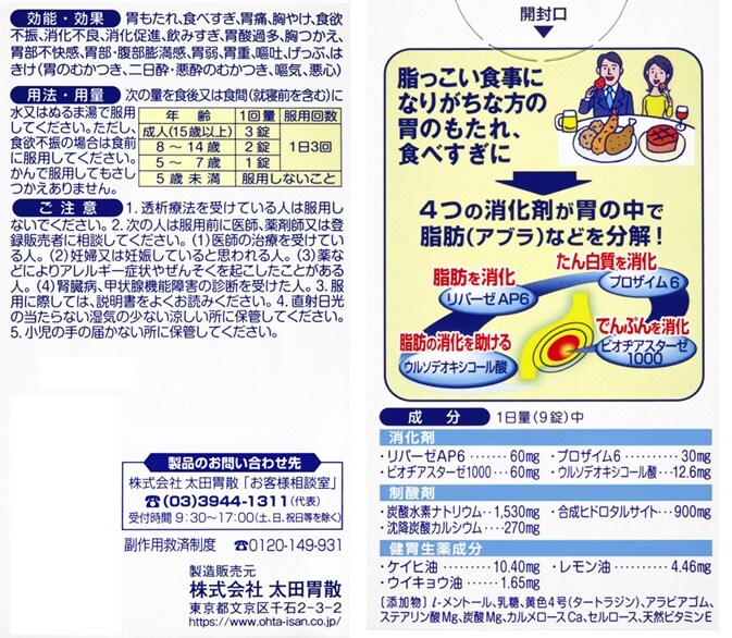 脂っこい食事による「胃もたれ」や、「食べすぎ」におすすめの太田胃散A錠剤。