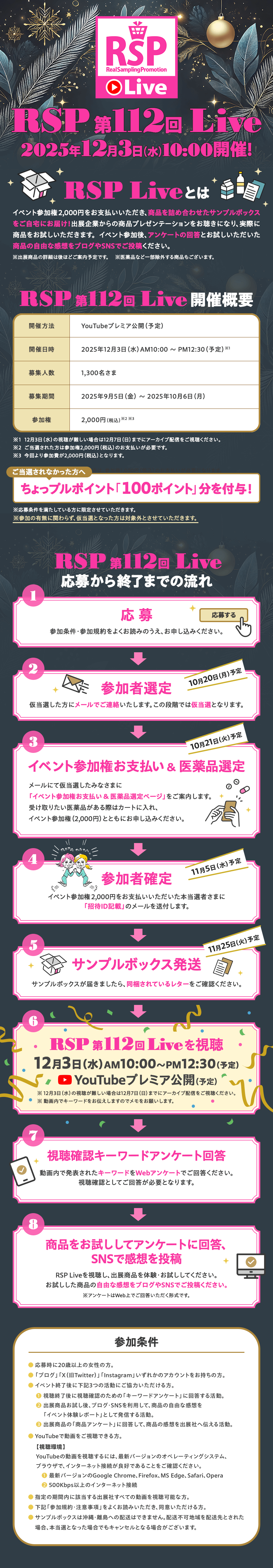 商品を詰め合わせたサンプルボックスをお届け!RSP 第112回 Live 2025/12/3(水)配信 |ご当選されなかった方へちょっプルポイント100ポイントを付与!ご応募お待ちしております!!