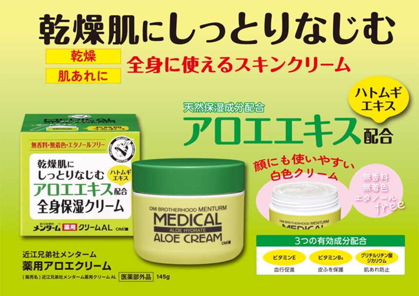 発売から36年のロングセラー商品「近江兄弟社メンタームメディカルクリームGn(薬用クリームG)」のシリーズ品として、手ごわい乾燥肌をやさしく保湿ケアする「近江兄弟社メンターム薬用アロエクリーム」を新発売しました。