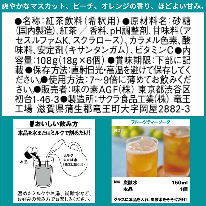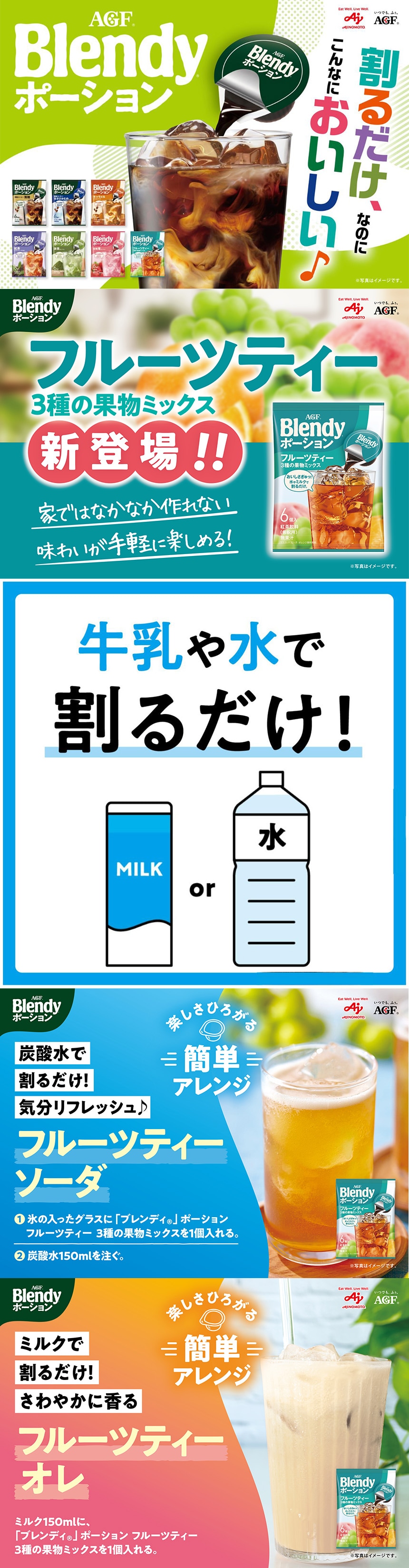 「Blendy(ブレンディ)」 ポーションは、冷たい牛乳(ミルク)や水をそそぐだけで簡単に、コクのあるアイスカフェオレやアイスコーヒー、ミルクティーやアイスティー、フルーツティーなどが楽しめる濃縮タイプの希釈用ドリンク ポーションシリーズです。AGF(エージーエフ) 「ブレンディ」 ポーション フルーツティー 3種の果物ミックス 6個は、爽やかなマスカットの香りとピーチ、オレンジのほどよいみずみずしい甘みが特徴のフルーツティーです。1杯1杯がいつも便利な個包装タイプ。水はもちろん、炭酸水やミルクで割ってもおいしい味わいに仕上げているので、フルーツオレなど様々なアレンジが楽しめます。お好みで豆乳やアーモンドミルク、低脂肪乳などでもお楽しみいただけます。